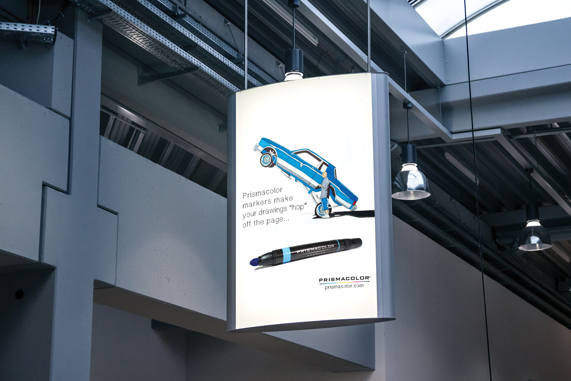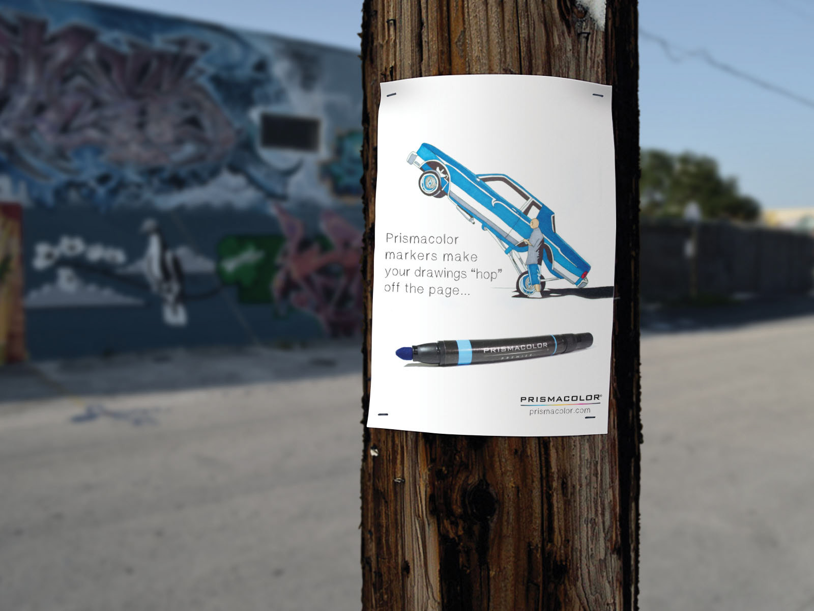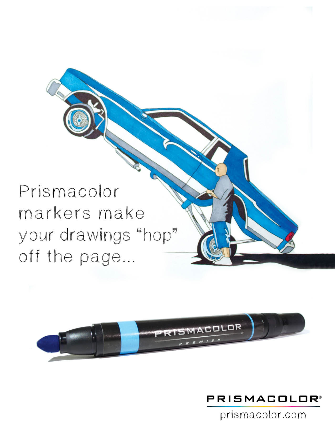 This is a full page ad design for Prismacolor Markers. It is meant to showcase the application of the markers with a hand drawn illustration. The typeface choice also portrays a sense of craftsmanship and hand illustration.